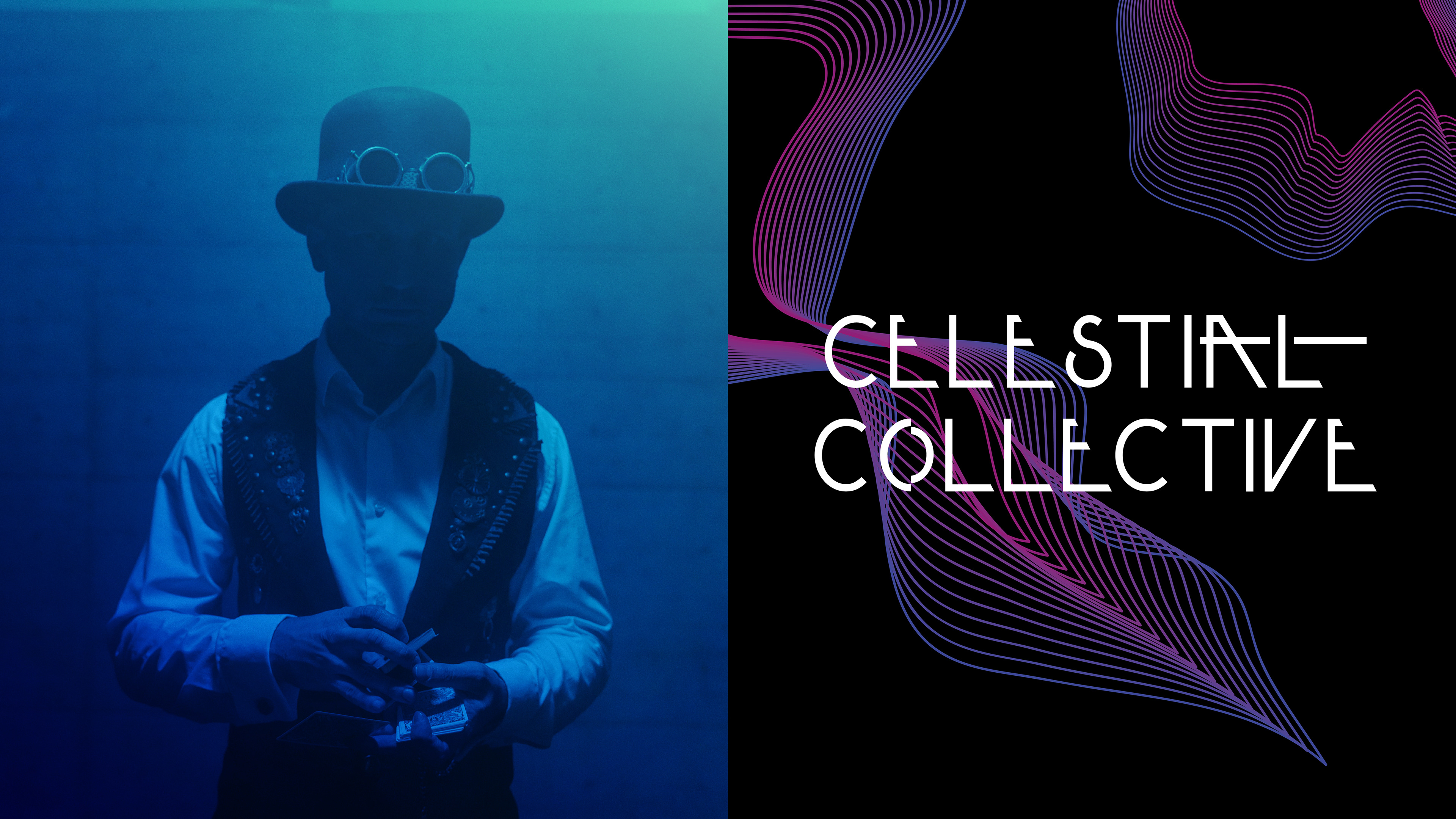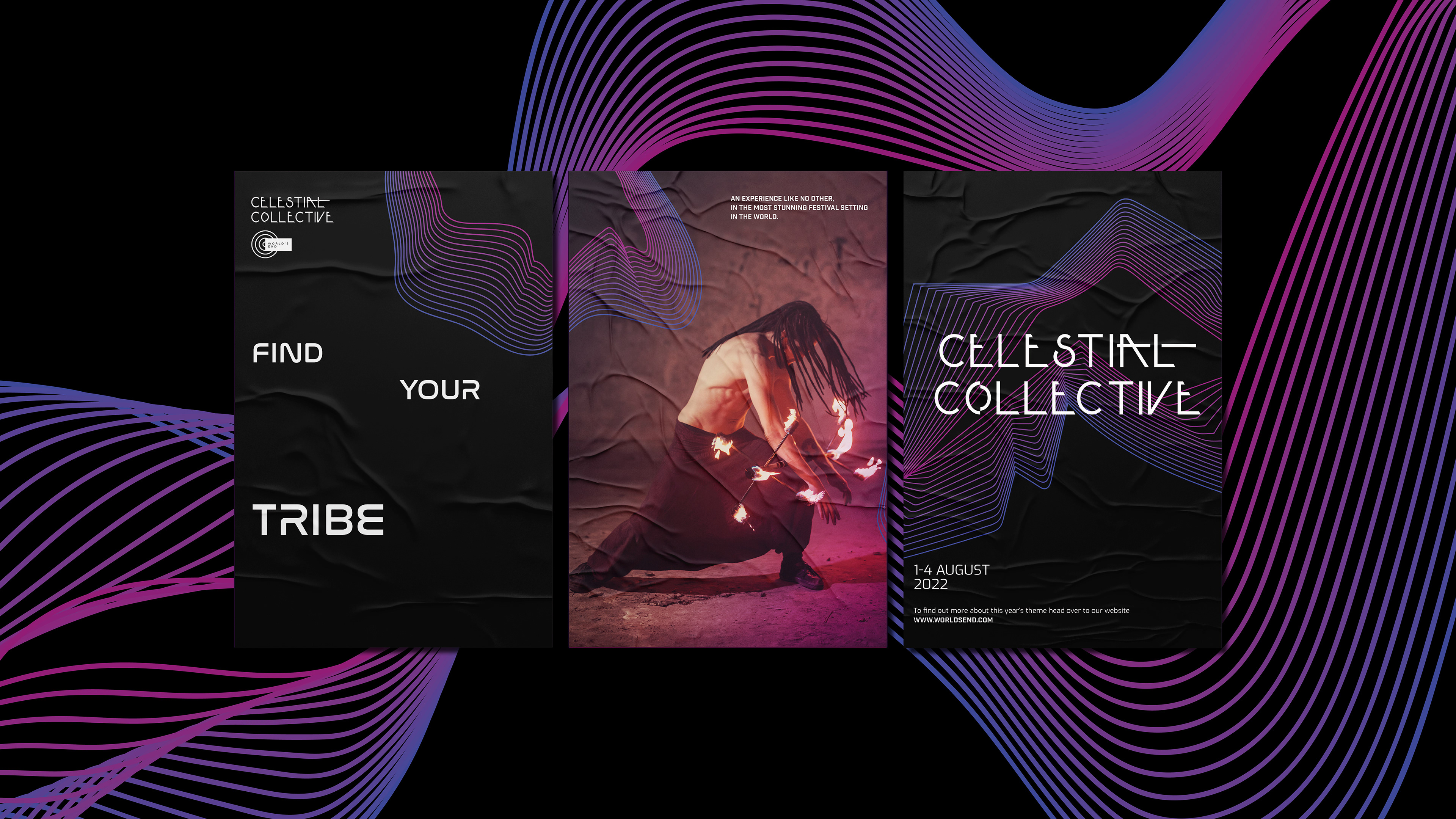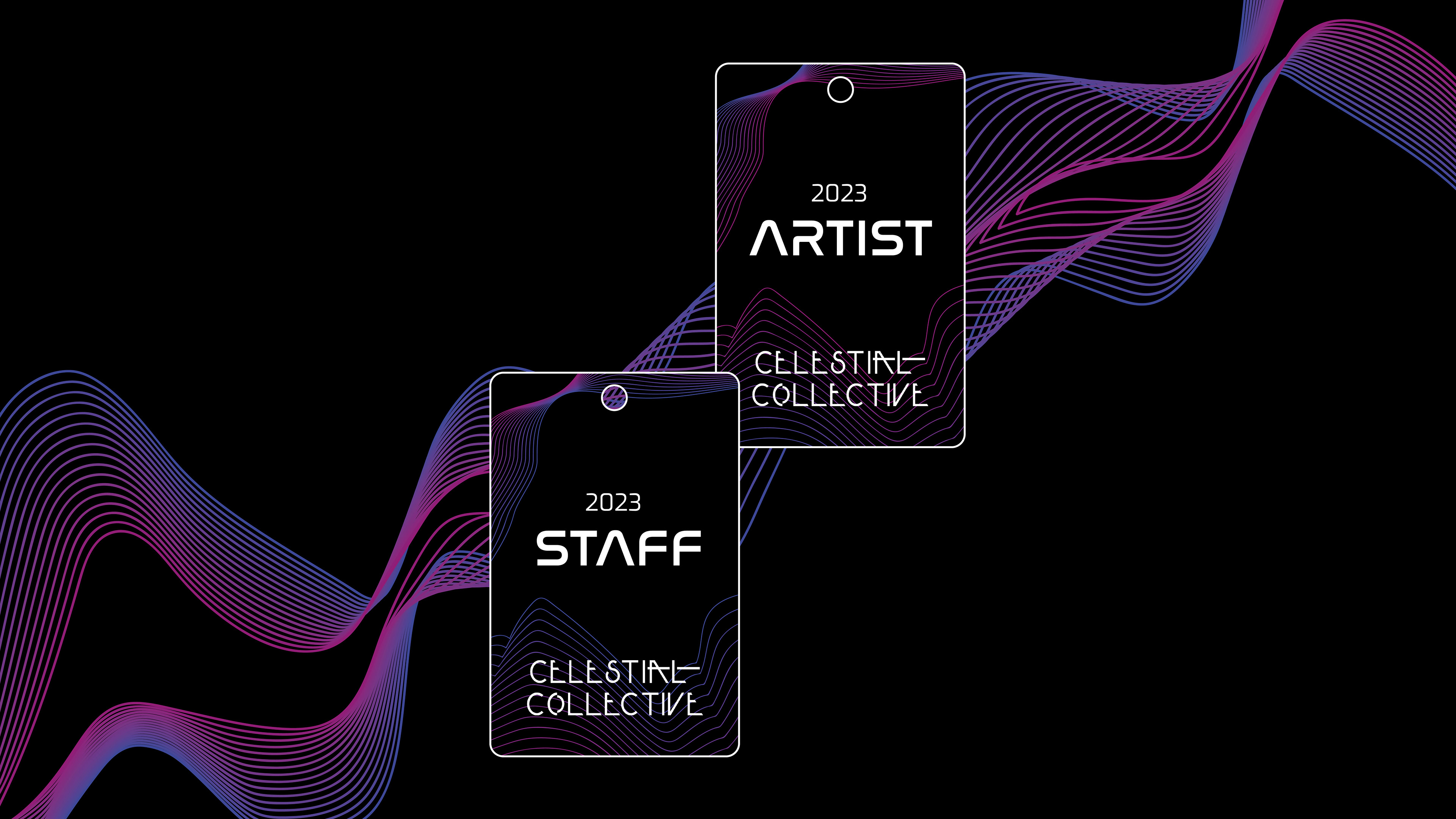 North American festivals tend to have very similar competing design, often more complicated than is needed. Celestial Collective features stripped back minimalist graphics with a modern and experimental type lock-up.